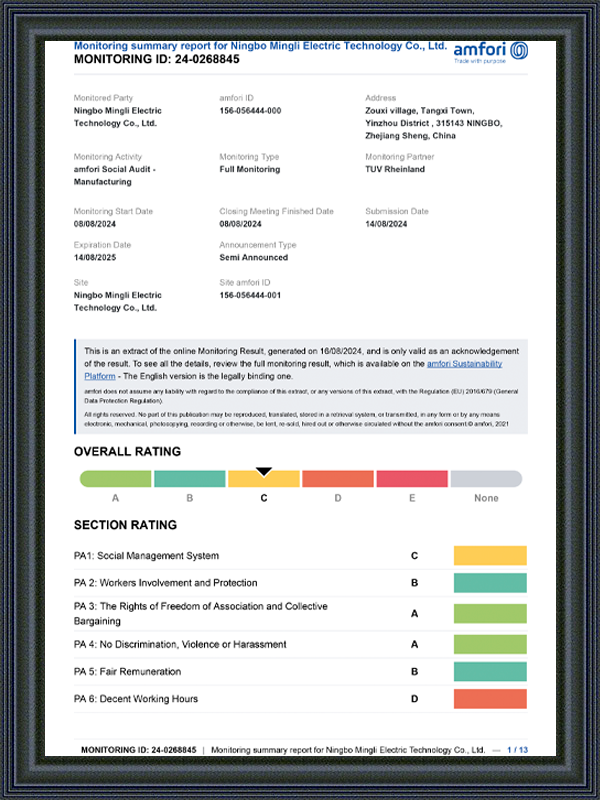 মিংলি বৈদ্যুতিক গুণমান নিয়ন্ত্রণে একটি মাল্টি-লিংক পরিদর্শন প্রক্রিয়া প্রয়োগ করে, কেবল সমাপ্ত পণ্যের আকার এবং কাঠামো পরীক্ষা করেই নয়, পৃষ্ঠের চিকিত্সা স্তরটির বেধ, অভিন্নতা, আঠালো এবং লবণের স্প্রে প্রতিরোধের নমুনা ও পরীক্ষা করে শিট ধাতব পণ্যগুলির প্রতিটি ব্যাচ পরিবহন, সঞ্চয় এবং ব্যবহারের সময় একটি ভাল অবস্থার বজায় রাখতে পারে তা নিশ্চিত করে। সংস্থাটি বেসিক টেস্টিং ইনস্ট্রুমেন্টগুলিতে সজ্জিত এবং টার্মিনাল বাজারে মানসম্পন্ন পরিদর্শন বা শংসাপত্র প্রক্রিয়া সফলভাবে সম্পন্ন করতে গ্রাহকদের সহায়তা করার জন্য পরীক্ষার প্রতিবেদন এবং সম্মতি নথি সরবরাহ করতে যোগ্য তৃতীয় পক্ষের পরীক্ষামূলক এজেন্সিগুলিকেও সহযোগিতা করবে।